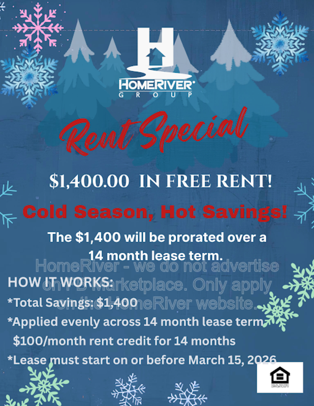HomeRiver Group does not advertise properties on Craigslist, LetGo, or other classified ad websites. If you suspect one of our properties has been fraudulently listed on these platforms, please notify HomeRiver Group immediately. We never accept wire transfers or payments via Zelle, PayPal, or Cash App. Lease your home safely through www.Homeriver.com or with the assistance of a licensed HomeRiver Group leasing agent. All leasing information contained herein is deemed accurate but not guaranteed. Please note that changes may have occurred since the photographs were taken. Square footage is estimated.