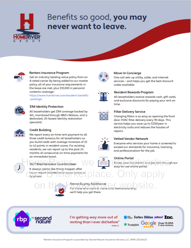 HomeRiver Group does not advertise properties on Craigslist, LetGo, or other classified ad websites. If you suspect one of our properties has been fraudulently listed on these platforms, please notify HomeRiver Group immediately. All payments related to leasing with HomeRiver Group are made exclusively through our website. We never accept wire transfers or payments via Zelle, PayPal, or Cash App. Lease your home safely through www.Homeriver.com or with the assistance of a licensed HomeRiver Group leasing agent. All leasing information contained herein is deemed accurate but not guaranteed. Please note that changes may have occurred since the photographs were taken. Square footage is estimated.