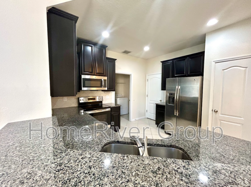 The heart of the home is the stylish kitchen, equipped with stainless steel appliances, sleek granite countertops, and a convenient breakfast bar for casual dining. Adjacent to the kitchen, the laundry room comes with a full-size washer and dryer for added convenience.