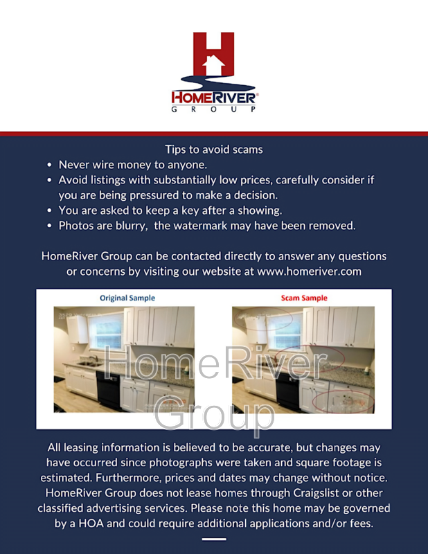 HomeRiver Group does not advertise properties on Craigslist, LetGo, or other classified ad websites. If you suspect one of our properties has been fraudulently listed on these platforms, please notify HomeRiver Group immediately. All payments related to leasing with HomeRiver Group are made exclusively through our website. We never accept wire transfers or payments via Zelle, PayPal, or Cash App. Lease your home safely through www.Homeriver.com or with the assistance of a licensed HomeRiver Group leasing agent. All leasing information contained herein is deemed accurate but not guaranteed. Please note that changes may have occurred since the photographs were taken. Square footage is estimated.